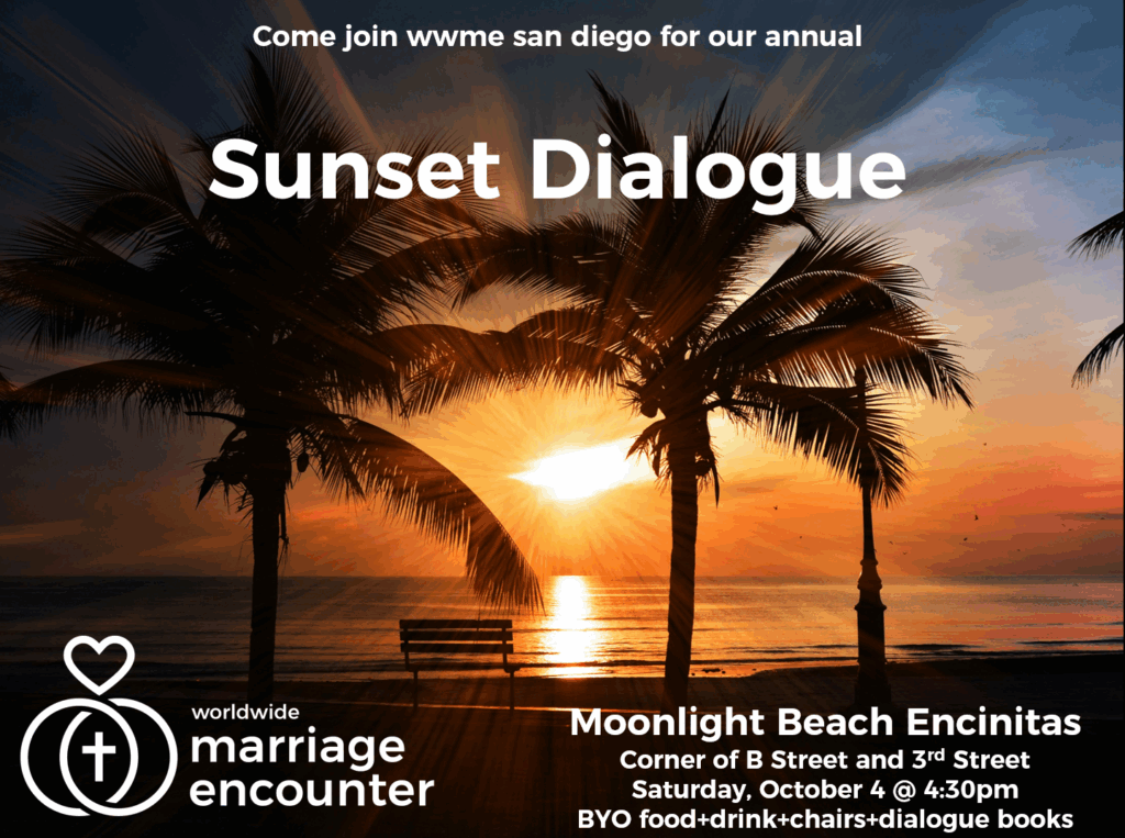Join us on Saturday, October 4th for our annual Sunset Dialogue event at Moonlight Beach. No reservations required. Just bring yourselves, a picnic dinner, your dialogue books, and some chairs to sit on. Look for the Marriage Encounter pop-up.